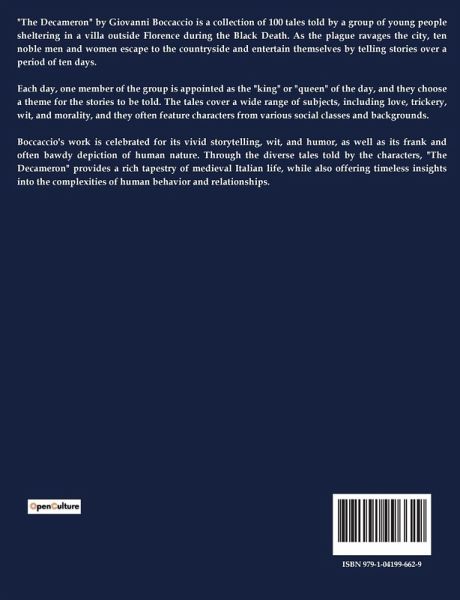 "The Decameron" by Giovanni Boccaccio is a collection of 100 tales told by a group of young people sheltering in a villa outside Florence during the Black Death. As the plague ravages the city, ten noble men and women escape to the countryside and entertain themselves by telling stories over a period of ten days. Each day, one member of the group is appointed as the "king" or "queen" of the day, and they choose a theme for the stories to be told. The tales cover a wide range of subjects, including love, trickery, wit, and morality, and they often feature characters from various social classes and backgrounds. Boccaccio's work is celebrated for its vivid storytelling, wit, and humor, as well as its frank and often bawdy depiction of human nature. Through the diverse tales told by the characters, "The Decameron" provides a rich tapestry of medieval Italian life, while also offering timeless insights into the complexities of human behavior and relationships.