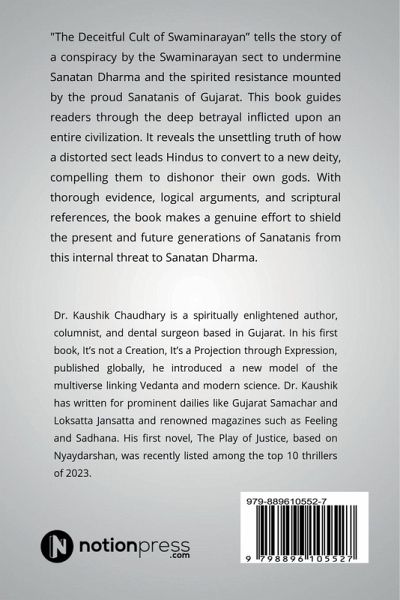 "The Deceitful Cult of a Fake Narayan" tells the story of a conspiracy by the Swaminarayan sect to undermine Sanatan Dharma and the spirited resistance mounted by the proud Sanatanis of Gujarat. This book guides readers through the deep betrayal inflicted upon an entire civilization. It reveals the unsettling truth of how a distorted sect leads Hindus to convert to a new deity, compelling them to dishonor their own gods. With thorough evidence, logical arguments, and scriptural references, the book makes a genuine effort to shield the present and future generations of Sanatanis from this internal threat to Sanatan Dharma. It serves as a historical record, reminding both current and future generations how Gujarat's awakened Hindu society courageously resisted this internal assault and showed remarkable resolve to protect their Sanatan Dharma from becoming, internally, akin to Islamic or Christian traditions.