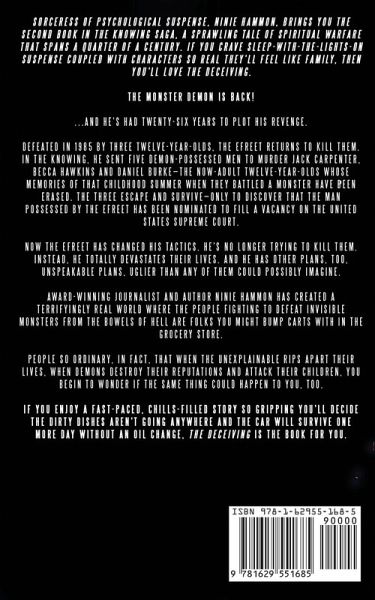 Sorceress of psychological suspense, Ninie Hammon, brings you the second book in The Knowing Saga, a sprawling tale of spiritual warfare that spans a quarter of a century. If you crave sleep-with-the-lights-on suspense coupled with characters so real they'll feel like family, then you'll love The Deceiving. The monster demon is BACK! ...and he's had twenty-six years to plot his revenge. Defeated in 1985 by three twelve-year-olds, the efreet returns to kill them. In The Knowing, he sent five demon-possessed men to murder Jack Carpenter, Becca Hawkins and Daniel Burke-the now-adult twelve-year-olds whose memories of that childhood summer when they battled a monster have been erased. The three escape and survive-only to discover that the man possessed by the efreet has been nominated to fill a vacancy on the United States Supreme Court. Now the efreet has changed his tactics. He's no longer trying to kill them. Instead, he totally devastates their lives. And he has other plans, too, unspeakable plans, uglier than any of them could possibly imagine. Award-winning journalist and author Ninie Hammon has created a terrifyingly real world where the people fighting to defeat invisible monsters from the bowels of hell are folks you might bump carts with in the grocery store. People so ordinary, in fact, that when the unexplainable rips apart their lives, when demons destroy their reputations and attack their children, you begin to wonder if the same thing could happen to you, too. If you enjoy a fast-paced, chills-filled story so gripping you'll decide the dirty dishes aren't going anywhere and the car will survive one more day without an oil change, The Deceiving is the book for you.