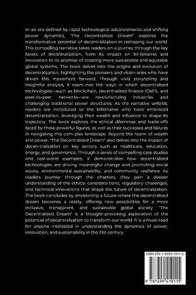 The Decentralized Dream: Billionaires, Innovation, and the Quest for Sustainable Global Power In an era defined by rapid technological advancements and shifting power dynamics, "The Decentralized Dream" explores the transformative potential of decentralization in reshaping our world. This compelling narrative takes readers on a journey through the key facets of decentralization, from its impact on billionaires and innovation to its promise of creating more sustainable and equitable global systems. The book delves into the origins and evolution of decentralization, highlighting the pioneers and visionaries who have driven this movement forward. Through vivid storytelling and insightful analysis, it examines the ways in which decentralized technologies-such as blockchain, decentralized finance (DeFi), and peer-to-peer networks-are revolutionizing industries and challenging traditional power structures. As the narrative unfolds, readers are introduced to the billionaires who have embraced decentralization, leveraging their wealth and influence to shape its trajectory. The book explores the ethical dilemmas and trade-offs faced by these powerful figures, as well as their successes and failures in navigating this complex landscape. Beyond the realm of wealth and power, "The Decentralized Dream" also delves into the impact of decentralization on key sectors such as healthcare, education, energy, and governance. Through a series of compelling case studies and real-world examples, it demonstrates how decentralized technologies are driving meaningful change and promoting social equity, environmental sustainability, and community resilience. As readers journey through the chapters, they gain a deeper understanding of the ethical considerations, regulatory challenges, and technical innovations that shape the future of decentralization. The book concludes by envisioning a future where the decentralized dream becomes a reality, offering new possibilities for a more inclusive, transparent, and sustainable global society. "The Decentralized Dream" is a thought-provoking exploration of the potential of decentralization to transform our world. It is a must-read for anyone interested in understanding the dynamics of power, innovation, and sustainability in the 21st century.