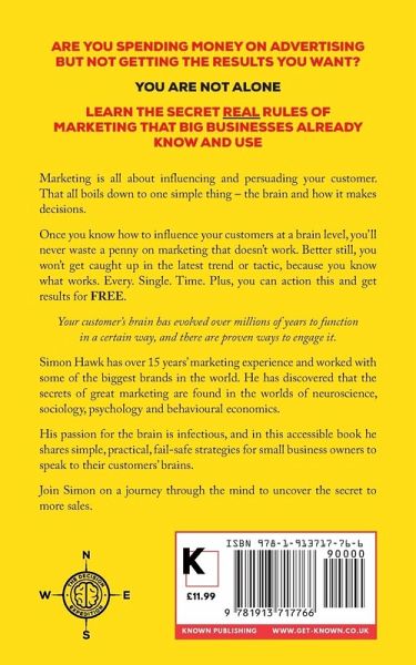 ARE YOU SPENDING MONEY ON ADVERTISING BUT NOT GETTING THE RESULTS YOU WANT? YOU ARE NOT ALONE LEARN THE SECRET REAL RULES OF MARKETING THAT BIG BUSINESSES ALREADY KNOW AND USE Marketing is all about influencing and persuading your customer. That all boils down to one simple thing - the brain and how it makes decisions. Once you know how to influence your customers at a brain level, you'll never waste a penny on marketing that doesn't work. Better still, you won't get caught up in the latest trend or tactic, because you know what works. Every. Single. Time. Plus, you can action this and get results for FREE. Your customer's brain has evolved over millions of years to function in a certain way, and there are proven ways to engage it. Simon Hawk has over 15 years' marketing experience and worked with some of the biggest brands in the world. He has discovered that the secrets of great marketing are found in the worlds of neuroscience, sociology, psychology and behavioural economics. His passion for the brain is infectious, and in this accessible book he shares simple, practical, fail-safe strategies for small business owners to speak to their customers' brains. Join Simon on a journey through the mind to uncover the secret to more sales.