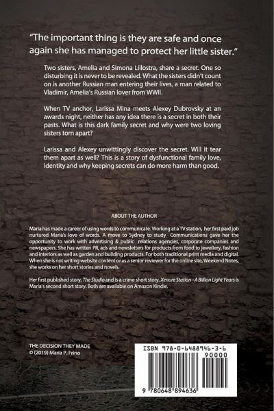 Two sisters, Amelia and Simona Lillostra, share a secret. One so distressing to them it is never to be revealed. What they didn't count on is a young Russian man entering their lives, a man related to Amelia's Russian lover from WWII. When TV anchor, Larissa Mina meets Alexey Dubrovsky at an awards night, neither has any idea there is a secret in both their pasts. What is this dark family secret and why were two loving sisters torn apart?
