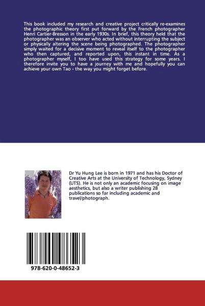 This book included my research and creative project critically re-examines the photographic theory first put forward by the French photographer Henri Cartier-Bresson in the early 1930s. In brief, this theory held that the photographer was an observer who acted without interrupting the subject or physically altering the scene being photographed. The photographer simply waited for a decisive moment to reveal itself to the photographer who then captured, and reported upon, this instant in time. As a photographer myself, I too have used this strategy for some years. I therefore invite you to have a journey with me and hopefully you can achieve your own Tao - the way you might forget before.