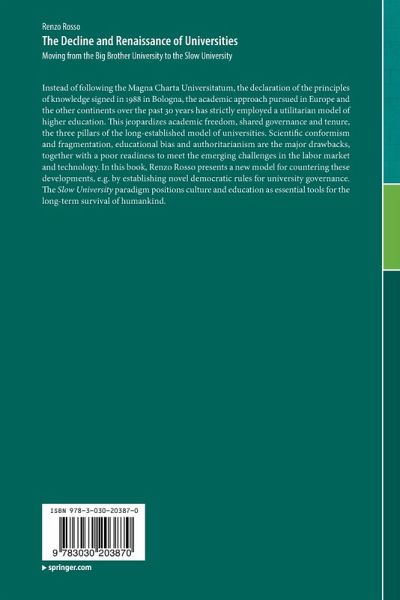 Instead of following the Magna Charta Universitatum, the declaration of the principles of knowledge signed in 1988 in Bologna, the academic approach pursued in Europe and the other continents over the past 30 years has strictly employed a utilitarian model of higher education. This jeopardizes academic freedom, shared governance and tenure, the three pillars of the long-established model of universities. Scientific conformism and fragmentation, educational bias and authoritarianism are the major drawbacks, together with a poor readiness to meet the emerging challenges in the labor market and technology. In this book, Renzo Rosso presents a new model for countering these developments, e.g. by establishing novel democratic rules for university governance. The Slow University paradigm positions culture and education as essential tools for the long-term survival of humankind.