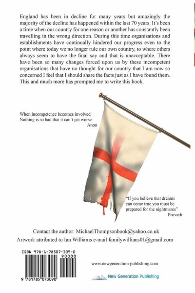 England has been in decline for many years but amazingly the majority of the decline has happened within the last 70 years. It's been a time when our country for one reason or another has constantly been travelling in the wrong direction. During this time organisations and establishments have continually hindered our progress even to the point where today we no longer rule our own country, to where others always seem to have the final say and that is unacceptable. There have been so many changes forced upon us by these incompetent organisations that have no thought for our country that I am now so concerned I feel that I should share the facts just as I have found them. This and much more has prompted me to write this book.