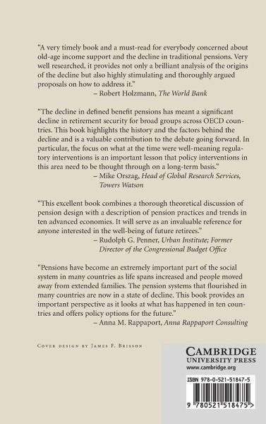 The traditional (final or average salary) pension that employers have provided their employees has suffered a huge decline in labor force coverage in the United Kingdom and the United States, and less severe declines in Canada and elsewhere. The traditional pension provides a precious measure of retirement security by paying retirees an annuity for life. This study compares developments in the countries just named and in Australia, Denmark, Germany, Japan, Netherlands, Sweden, and Switzerland to explain the forces behind the decline of the traditional pension and to contrast the experience of public sector employer-provided plans, where it remains dominant. Given the great value of the longevity insurance that the traditional plan provides, and the risks its diminished coverage entails, the book proposes a set of measures that either stem the decline or endow defined contribution pensions with some of the attributes of the traditional plan.