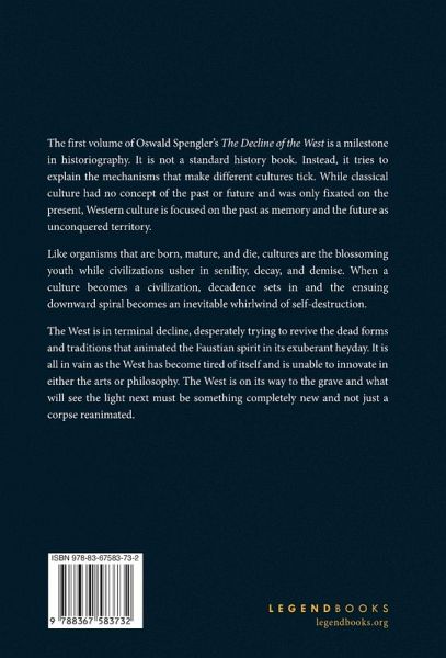 The first volume of Oswald Spengler's The Decline of the West is a milestone in historiography. It is not a standard history book. Instead, it tries to explain the mechanisms that make different cultures tick. While classical culture had no concept of the past or future and was only fixated on the present, Western culture is focused on the past as memory and the future as unconquered territory. Like organisms that are born, mature, and die, cultures are the blossoming youth while civilizations usher in senility, decay, and demise. When a culture becomes a civilization, decadence sets in and the ensuing downward spiral becomes an inevitable whirlwind of self-destruction. The West is in terminal decline, desperately trying to revive the dead forms and traditions that animated the Faustian spirit in its exuberant heyday. It is all in vain as the West has become tired of itself and is unable to innovate in either the arts or philosophy. The West is on its way to the grave and what will see the light next must be something completely new and not just a corpse reanimated.