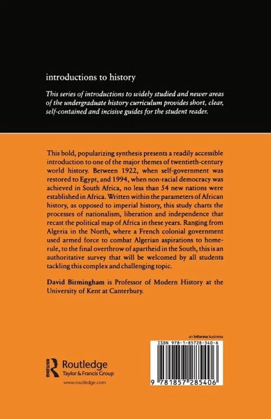 This bold, popularizing synthesis presents a readily accessible introduction to one of the major themes of the twentieth-century world history. Between 1922, when self-government was restored to Egypt, and 1994, when non-racial democracy was achieved in South Africa, no less than 54 new nations were established in Africa. Written within the parameters of African history, as opposed to imperial history, this study charts the process of nationalism, liberation and independence that recast the political map of Africa in these years. Ranging from Algeria in the North, where a French colonial government used armed force to combat the Algerian aspirations of home rule, to the final overthrow of apartheid in the South, this is an authoritative survey that will be welcomed by all students tackling this complex and challenging topic.