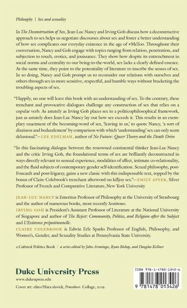 In The Deconstruction of Sex, Jean-Luc Nancy and Irving Goh discuss how a deconstructive approach to sex helps us negotiate discourses about sex and foster a better understanding of how sex complicates our everyday existence in the age of #MeToo. Throughout their conversation, Nancy and Goh engage with topics ranging from relation, penetration, and subjection to touch, erotics, and jouissance. They show how despite its entrenchment in social norms and centrality to our being-in-the-world, sex lacks a clearly defined essence. At the same time, they point to the potentiality of literature to inscribe the senses of sex. In so doing, Nancy and Goh prompt us to reconsider our relations with ourselves and others through sex in more sensitive, respectful, and humble ways without bracketing the troubling aspects of sex.