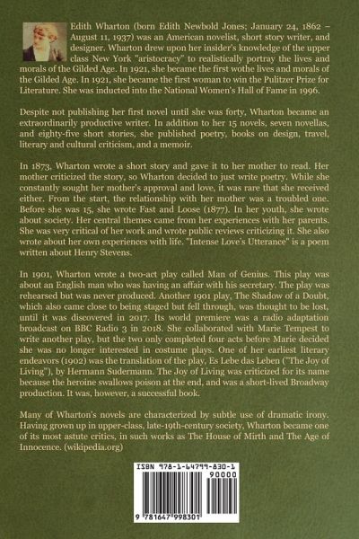 Edith Wharton (born Edith Newbold Jones; January 24, 1862 - August 11, 1937) was an American novelist, short story writer, and designer. Wharton drew upon her insider's knowledge of the upper class New York "aristocracy" to realistically portray the lives and morals of the Gilded Age. In 1921, she became the first woman to win the Pulitzer Prize for Literature. She was inducted into the National Women's Hall of Fame in 1996. Despite not publishing her first novel until she was forty, Wharton became an extraordinarily productive writer. In addition to her 15 novels, seven novellas, and eighty-five short stories, she published poetry, books on design, travel, literary and cultural criticism, and a memoir. In 1873, Wharton wrote a short story and gave it to her mother to read. Her mother criticized the story, so Wharton decided to just write poetry. While she constantly sought her mother's approval and love, it was rare that she received either. From the start, the relationship with her mother was a troubled one. Before she was 15, she wrote Fast and Loose (1877). In her youth, she wrote about society. Her central themes came from her experiences with her parents. She was very critical of her work and wrote public reviews criticizing it. She also wrote about her own experiences with life. "Intense Love's Utterance" is a poem written about Henry Stevens. In 1901, Wharton wrote a two-act play called Man of Genius. This play was about an English man who was having an affair with his secretary. The play was rehearsed but was never produced. Another 1901 play, The Shadow of a Doubt, which also came close to being staged but fell through, was thought to be lost, until it was discovered in 2017. Its world premiere was a radio adaptation broadcast on BBC Radio 3 in 2018. She collaborated with Marie Tempest to write another play, but the two only completed four acts before Marie decided she was no longer interested in costume plays. One of her earliest literary endeavors (1902) was the translation of the play, Es Lebe das Leben ("The Joy of Living"), by Hermann Sudermann. The Joy of Living was criticized for its name because the heroine swallows poison at the end, and was a short-lived Broadway production. It was, however, a successful book. Many of Wharton's novels are characterized by subtle use of dramatic irony. Having grown up in upper-class, late-19th-century society, Wharton became one of its most astute critics, in such works as The House of Mirth and The Age of Innocence. (wikipedia.org)