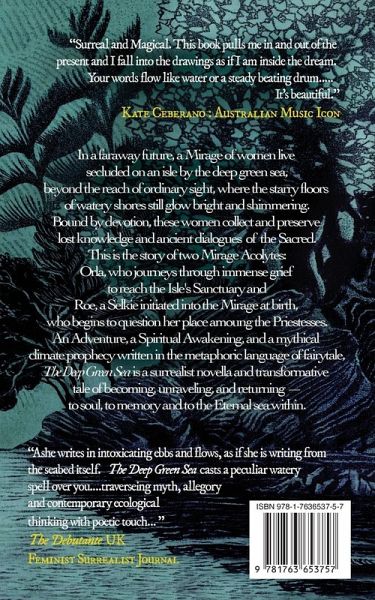 The Deep Green Sea - A Hauntingly Illustrated Literary Journey Through Myth and Memory, Death and Rebirth. ✨ The Deep Green Sea is a premium Illustrated Novella of mythopoetic, surrealist, eco-feminist speculative fiction. "Surreal and magical... like falling into a dream." - Kate Ceberano, Australian Musical Icon "Equally harrowing as it is beautiful." - Kate Walsh, American Actress "Ashe writes in intoxicating ebbs and flows... a watery spell." - The Debutante Feminist Surrealist Journal In a far-off future, after the Second Deluge, a secret order of women-The Mirage-live secluded on an island hidden by tides and time. Drifting between myth, memory, and ecological allegory, The Deep Green Sea tells the dual tale of Orla, a grieving acolyte searching for the Isle's sanctuary, and Roe, a Selkie child born in liminal shadow, carrying a mysterious fate. Through stunning lyrical prose and haunting artwork, Kelsey Ashe crafts a modern myth that speaks to our longing for healing, rebirth, and reconnection with the natural world. Written and illustrated by award-winning Australian artist Dr. Kelsey Ashe , this novella is both a visual and literary odyssey. * 260 pages * 55 original illustrations For readers of: Women Who Run With the Wolves, The Mists of Avalon, Angela Carter, Clarissa Pinkola Estés, Jeanette Winterson, Sharon Blackie, Ithel Coloquhon. Genre: Mythic Fiction, Sea Stories, Feminist Fantasy, Mysticism Themes: Grief and transformation, sacred feminine, ecological wisdom, ritual, soul journey, post-apocalyptic sublime "Like living inside a painting and a poem all at once..." - Reader Review "A story within a story and a dream within a dream...Intoxicating!" - Reader Review