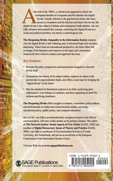 The Deepening Divide: Inequality in the Information Society explains why the digital divide is still widening and, in advanced high-tech societies, deepening. Taken from an international perspective, the book offers full coverage of the literature and research and a theoretical framework from which to analyze and approach the issue. Where most books on the digital divide only describe and analyze the issue, Jan van Dijk presents 26 policy perspectives and instruments designed to close the divide itself.