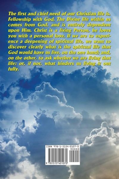 The first and chief need of our Christian life is, Fellowship with God. The Divine life within us comes from God, and is entirely dependent upon Him. Christ is a living Person, he loves you with a personal love. If we are to experience a deepening of spiritual life, we want to discover clearly what is the spiritual life that God would have us live, on the one hand; and, on the other, to ask whether we are living that life; or, if not, what hinders us living it out fully.