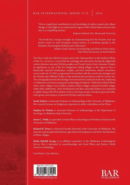The Deer Creek site (34KA3), located next to the Arkansas River in the Southern Plains of the U.S., served as a crucial hub for exchange and interaction during the eighteenth century between ancestral Wichita peoples and French traders from Louisiana. Despite its significance as one of the few Indigenous trading villages in the region to have a historically reported fortification complex, previous owners denied researchers access to the site. In 2016, an agreement was reached with the current site managers and the Wichita and Affiliated tribes so that the professional excavations could be carried out. This monograph presents the findings of recent research conducted at the site, employing a combination of remote sensing and archaeological methods. Unlike the northern Plains where entire villages were fortified, southern Plains villages contained fortified refuges within their settlements. These fortifications and their associated features are examined in depth, along with DNA analysis of horse and dog remains, European guns and other trade goods, and analyses of ancestral Wichita material culture.