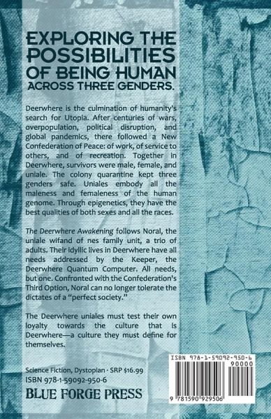 Exploring the possibilities of being human, across three genders and beyond, The Deerwhere Awakening is a timely story for our present. Deerwhere is the culmination of humanity's search for Utopia. After centuries of wars, overpopulation, political disruption, and global pandemics, there followed a New Confederation of Peace: of work, of service to others, and of recreation. Together in Deerwhere, survivors were male, female, and uniale. The colony quarantine kept three genders safe. Uniales embody all the maleness and femaleness of the human genome. Through epigenetics, they have the best qualities of both sexes and all the races. The Deerwhere Awakening follows Noral, the uniale wifand of nes family unit, a trio of adults. Their idyllic lives in Deerwhere have all needs addressed by the Keeper, the Deerwhere Quantum Computer. All needs, but one. Confronted with the Confederation's Third Option, Noral can no longer tolerate the dictates of a "perfect society." The Deerwhere uniales must test their own loyalty towards the culture that is Deerwhere-a culture they must define for themselves.