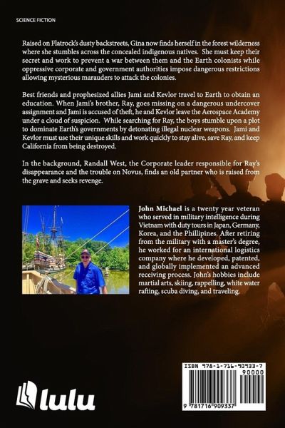 Raised on Flatrock's dusty backstreets, Gina now finds herself in the forest wilderness where she stumbles across the concealed indigenous natives. She must keep their secret and work to prevent a war between them and the Earth colonists while oppressive corporate and government authorities impose dangerous restrictions allowing mysterious marauders to attack the colonies. Best friends and prophesized allies Jami and Kevlor travel to Earth to obtain an education. When Jami's brother, Ray, goes missing on a dangerous undercover assignment and Jami is accused of theft, he and Kevlor leave the Aerospace Academy under a cloud of suspicion. While searching for Ray, the boys stumble upon a plot to dominate Earth's governments by detonating illegal nuclear weapons. Jami and Kevlor must use their unique skills and work quickly to stay alive, save Ray, and keep California from being destroyed. In the background, Randall West, the Corporate leader responsible for Ray's disappearance and the trouble on Novus, finds an old partner who is raised from the grave and seeks revenge.