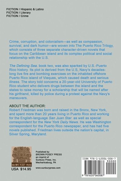Crime, corruption, and colonialism-as well as compassion, survival, and dark humor-are woven into The Puerto Rico Trilogy, which consists of three separate character-driven novels that focus on the Caribbean island and its complex political and social relationship with the U.S. The Defining Sea. book two, was also sparked by U.S.-Puerto Rico history. Its plot is derived from the U.S, Navy's decades-long live fire and bombing exercises on the inhabited offshore Puerto Rico island of Vieques, which caused death and serious illness. The story told concerns a 20-year-old University of Puerto Rico student who delivers drugs between the island and the states to raise money for a scholarship that will be named after his girlfriend, killed by police during a protest against the Navy's maneuvers.