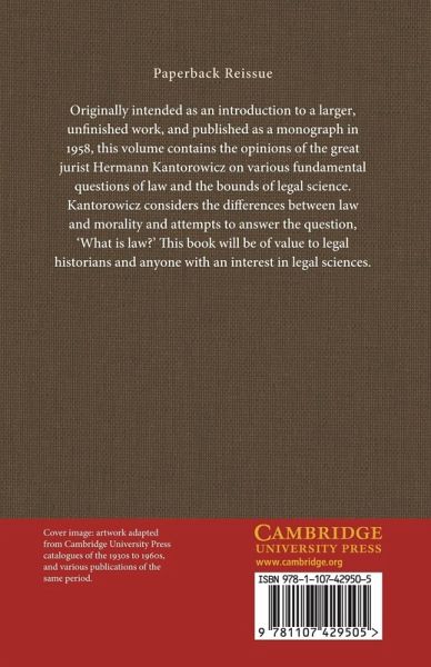 Originally intended as an introduction to a larger, unfinished work, and published as a monograph in 1958, this volume contains the opinions of the great jurist Hermann Kantorowicz on various fundamental questions of law and the bounds of legal science. Kantorowicz considers the differences between law and morality and attempts to answer the question, 'What is law?'. This book will be of value to legal historians and anyone with an interest in legal sciences.