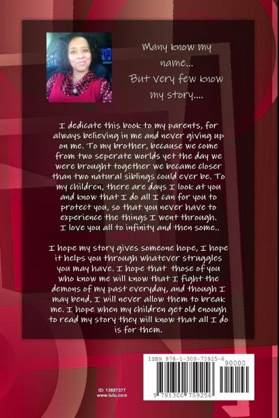 No one knows the struggles an adopted child faces unless they too have been adopted. This is a story of hope, about a child who was "given" up, not knowing why. It details the trials she went through at the hands of the people her mother gave her to. As she got older the need to fill that void, that was her biological families, grew stronger and so lead the pursuit of finding her biological families. Ultimately this story should inspire you, to push beyond the breaking point. It should give everyone hope that there is a light at the end of your tunnel.