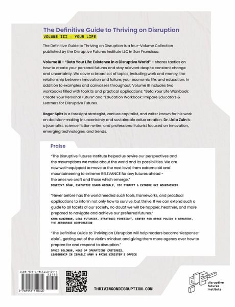 Discover how the proven business principles of beta testing can help you make better decisions, decrease overall risk, and improve the quality of your life, work, career, and all your projects! Just like in software development, it pays to be curious, innovative, and experimental. This book will show you how to reframe existence, become anticipatory, and exercise agency to upgrade yourself to make the most of our uncertain and disruptive world. Volume III - "Beta Your Life: Existence in a Disruptive World" - shares tactics, tools, and resources on how to create your personal and professional futures and stay relevant despite constant change and unpredictability. This bestselling book covers a broad set of topics, including work and money, the relationship between innovation and failure, your economic life, education, longevity, agency, and meaning. We also provide insights and case studies on the creator economy, as it has never been easier to monetize a creative idea. Anything that can be automated, cognified, decentralized, digitized, disintermediated, or virtualized will be. How can constantly learning, unlearning, and relearning help us build the capacity to thrive in this complex technological world? In addition to examples and templates, this guide includes two Workbooks filled with toolkits and practical applications: "Beta Your Life Workbook: Create Your Personal Future" and "Education Workbook: Prepare Educators & Learners for Disruptive Futures". Everything you need to jump-start your decision-making! Roger Spitz and Lidia Zuin draw on decades of insights from advising entrepreneurs, CEOs and their leadership teams in Silicon Valley and globally on evaluating their companies, competitiveness, strategic projects, innovations, and disruptions ahead. A foresight strategist, investor, and writer, Roger's expertise lies at the intersection of futures studies and sustainable value creation. Lidia is a journalist, science fiction writer, and professional futurist. Staying relevant is not a linear process, but a jumbled loop which you can untangle. Are you ready to learn the moves to becoming and remaining relevant? Then order your copy of The Definitive Guide to Thriving on Disruption: Volume III, and start making better decisions today!