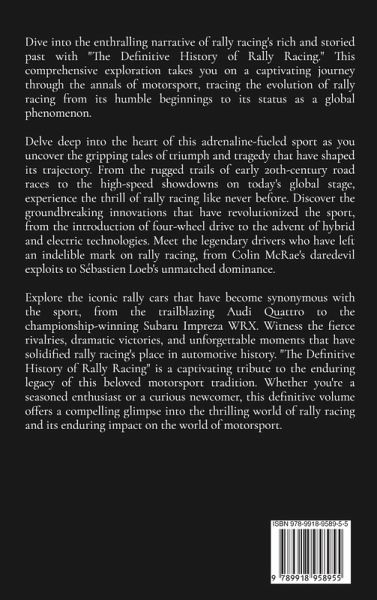 Dive into the enthralling narrative of rally racing's rich and storied past with "The Definitive History of Rally Racing." This comprehensive exploration takes you on a captivating journey through the annals of motorsport, tracing the evolution of rally racing from its humble beginnings to its status as a global phenomenon. Delve deep into the heart of this adrenaline-fueled sport as you uncover the gripping tales of triumph and tragedy that have shaped its trajectory. From the rugged trails of early 20th-century road races to the high-speed showdowns on today's global stage, experience the thrill of rally racing like never before. Discover the groundbreaking innovations that have revolutionized the sport, from the introduction of four-wheel drive to the advent of hybrid and electric technologies. Meet the legendary drivers who have left an indelible mark on rally racing, from Colin McRae's daredevil exploits to Sébastien Loeb's unmatched dominance. Explore the iconic rally cars that have become synonymous with the sport, from the trailblazing Audi Quattro to the championship-winning Subaru Impreza WRX. Witness the fierce rivalries, dramatic victories, and unforgettable moments that have solidified rally racing's place in automotive history. "The Definitive History of Rally Racing" is a captivating tribute to the enduring legacy of this beloved motorsport tradition. Whether you're a seasoned enthusiast or a curious newcomer, this definitive volume offers a compelling glimpse into the thrilling world of rally racing and its enduring impact on the world of motorsport.