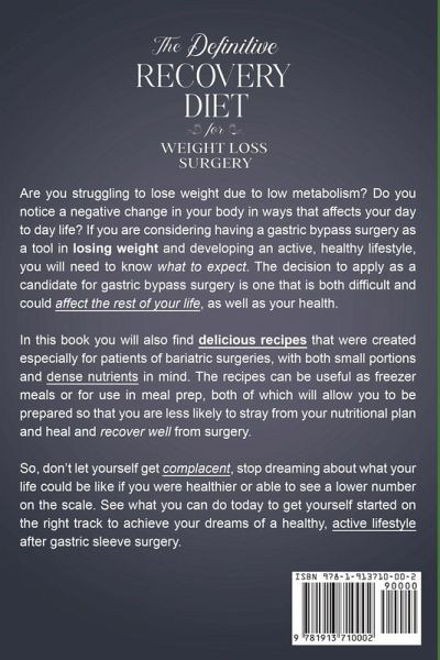 Discover How The Definitive Recovery Diet For Weight Loss Surgery Could Be Your Solution To Weight Loss and Bringing You Back To Peak Physical Health! Are you struggling to lose weight due to low metabolism? Do you notice a negative change in your body in ways that affects your day to day life? If you are considering having a gastric bypass surgery as a tool in losing weight and developing an active, healthy lifestyle, you will need to know what to expect. The decision to apply as a candidate for gastric bypass surgery is one that is both difficult and could affect the rest of your life, as well as your health. In "The Definitive Recovery Diet" You Will Learn And Find... • What The Alkaline Diet Is and Why You Need It • Information On The Four Types of Gastric Sleeve Surgeries That Are Most • Potential Barriers To Weight Loss Surgery • Why A Balanced Body pH Is Vital To Good Health • The Science and Chemistry Behind This Condition • Ways To Determine If You Are Ready For Weight Loss Surgery • The Ways Your Daily Habits Are Causing an Acid-Forming Diet • Tips and Secrets To This Powerhouse Diet • Guidelines That Medical Professionals Use In Determining If You Are A Good Fit For Bariatric Surgery BONUS • What Chronic Acid Reflux Is & Its Serious Health Implications • How To Prepare In The Months Leading Up To Your Bariatric Surgery • The Science Behind pH Imbalance • Delicious and Mouth-Watering Alkaline Meal Ideas • What To Expect During Your Recovery Period After Surgery Is Complete • The Role of Fibre, Prebiotics and Probiotic • Ideas for Meals, Snacks, and Even Desserts! • Some of the Best Foods for Healing Your Body • How To Reduce Acid Reflux With Exercise • How To Maintain and Become A Healthier Version of You And so much more… So, don't let yourself get complacent, stop dreaming about what your life could be like if you were healthier or able to see a lower number on the scale. See what you can do today to get yourself started on the right track to achieve your dreams of a healthy, active lifestyle after gastric sleeve surgery. Pick up your copy of the book right now by clicking the BUY NOW button at the top of this page! To Your Success!