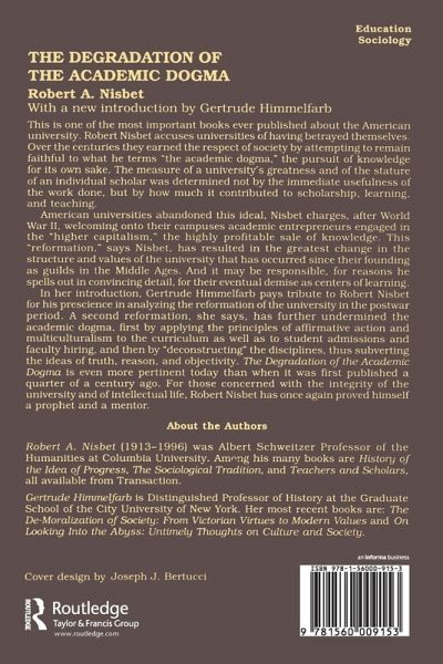 This is one of the most important books ever published about the American university. Robert Nisbet accuses universities of having betrayed themselves. Over the centuries they earned the respect of society by attempting to remain faithful to what he terms "the academic dogma," the pursuit of knowledge for its own sake. The measure of a university's greatness and of the stature of an individual scholar was determined not by the immediate usefulness of the work done, but by how much it contributed to scholarship, learning, and teaching. American universities abandoned this ideal, Nisbet charges, after World War II, welcoming onto their campuses academic entrepreneurs engaged in the "higher capitalism," the highly profitable sale of knowledge. This "reformation," says Nisbet, has resulted in the greatest change in the structure and values of the university that has occurred since their founding as guilds in the Middle Ages. And it may be responsible, for reasons he spells out in convincing detail, for their eventual demise as centers of learning. In her introduction, Gertrude Himmelfarb pays tribute to Robert Nisbet for his prescience in analyzing the reformation of the university in the postwar period. A second reformation, she says, has further undermined the academic dogma, first by applying the principles of affirmative action and multiculturalism to the curriculum as well as to student admissions and faculty hiring, and then by "deconstructing" the disciplines, thus subverting the ideas of truth, reason, and objectivity. The Degradation of the Academic Dogma is even more pertinent today than when it was first published a quarter of a century ago. For those concerned with the integrity of the university and of intellectual life, Robert Nisbet has once again proved himself a prophet and a mentor.