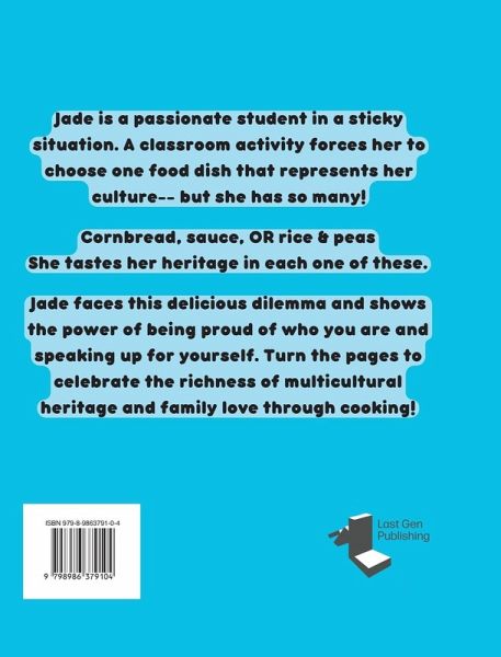 Jade is a passionate student in a sticky situation. A classroom activity forces her to choose one food dish that represents her culture-- but she has so many! ¿¿Cornbread, sauce, OR rice & peas She tastes her heritage in each one of these. Jade faces this delicious dilemma and shows the power of being proud of who you are and speaking up for yourself. Turn the pages to celebrate the richness of multicultural heritage and family love through cooking!