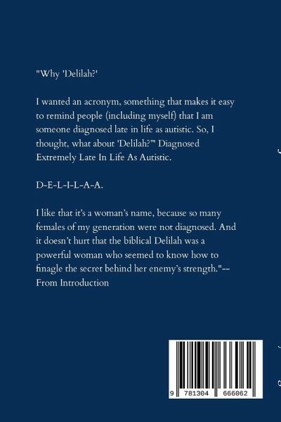 Playwright Carolyn Gage shares her reflections on being diagnosed as autistic at the age of 68. "Delilah" is an acronym for "diagnosed extremely late in life as autistic," and the author shares her thoughts on sex and relationships, communication, bullying, furniture, and a wide range of subjects from a neurodivergent perspective.