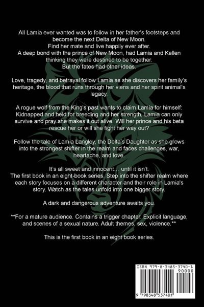 Lamia wanted to follow in her father's footsteps and become the next Delta of New Moon. Find her mate and live happily ever after. A deep bond with the prince of New Moon, had Lamia and Kellen thinking they were destined to be together. But the fates had other ideas. Love, tragedy, and betrayal follow Lamia as she discovers her family's heritage, the blood that runs through her veins, and her spirit animal's legacy. A rogue wolf from the King's past wants to claim Lamia for himself: Kidnapped and held for breeding and her strength, Lamia can only survive and pray she makes it out alive. Will her prince and his beta rescue her or will she fight her way out? Follow the tale of Lamia Langley, the Delta's Daughter as she grows into the strongest shifter in the realm and faces challenges, war, heartache, and love. It's all sweet and innocent... until it isn't. The first book in an eight-book series. Step into the shifter realm where each story focuses on a different character and their role in Lamia's story. Watch as the tales unfold into one bigger story. A dark and dangerous adventure awaits you. **For a mature audience. Contains a trigger chapter. Explicit language, and scenes of a sexual nature. Adult themes, sex, violence.** This is the first book in an eight-book series.