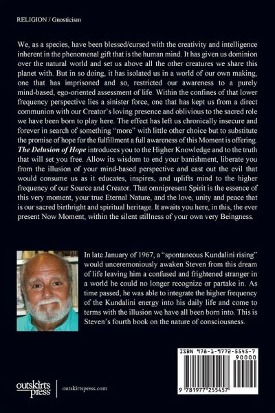 We, as a species, have been blessed/cursed with the creativity and intelligence inherent in the phenomenal gift that is the human mind. It has given us dominion over the natural world and set us above all the other creatures we share this planet with. But in so doing, it has isolated us in a world of our own making, one that has imprisoned and so, restricted our awareness to a purely mind-based, ego-oriented assessment of life. Within the confines of that lower frequency perspective lies a sinister force, one that has kept us from a direct communion with our Creator's loving presence and oblivious to the sacred role we have been born to play here. The effect has left us chronically insecure and forever in search of something "more" with little other choice but to substitute the promise of hope for the fulfillment a full awareness of this Moment is offering. The Delusion of Hope introduces you to the Higher Knowledge and to the truth that will set you free. Allow its wisdom to end your banishment, liberate you from the illusion of your mind-based perspective and cast out the evil that would consume us as it educates, inspires, and uplifts mind to the higher frequency of our Source and Creator. That omnipresent Spirit is the essence of this very moment, your true Eternal Nature, and the love, unity and peace that is our sacred birthright and spiritual heritage. It awaits you here, in this, the ever present Now Moment, within the silent stillness of your own very Beingness.