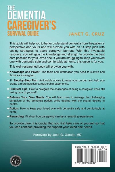 If you have a loved one with dementia, then The Dementia Caregivers Survival Guide is an essential read. This guide will equip you with the tools and knowledge to care for your loved one more efficiently to prevent caregiver burnout. You will understand the dementia patient's and caregiver's perspectives when dealing with dementia. This book is for you as a caregiver of a loved one facing the challenges of dementia. Understanding the progression of dementia will help you plan and prepare for the future. You may find this information powerful when deciding about your loved one's care. According to the Alzheimer's Association, over 16 million Americans are already providing care for a loved one suffering from dementia. Dementia caregivers often face challenges such as sleep deprivation, financial strains, emotional distress, depression, and anxiety. This guide will provide caregivers with the tools they need to cope with these challenges and provide the best possible care for their loved ones. You probably think that the best way to care for your loved one is by providing him/her with as much normalcy and routine as possible. This may help the patient feel comfortable and secure, while also giving you a sense of control during what can be a very chaotic and unpredictable time. You also believe that it is important to keep the lines of communication open with the patient and to never give up hope. You think that even though the disease may progress, there are still moments of connection and joy that can be shared between you as a caregiver and your loved one. Learning about the different stages of dementia will help you understand what your loved one is going through and, more importantly, anticipate his/her needs. This can help reduce stress and provide a more supportive environment. Knowing about the progressive nature of dementia can also help you make long-term plans for your loved one's care. To provide care, it is crucial that you first take care of yourself so that you can continue providing the support your loved one needs. If you are struggling to keep your loved one with dementia safe and comfortable at home, this guide is for you. This well-researched book will provide you with:Knowledge and Power: The tools and information you need to survive and thrive as a caregiver. 11 Step-by-Step Plan: Actionable advice to ease your burden and help you create a more positive caregiving experience. Practical Tips: How to navigate the challenges of being a caregiver while still taking care of yourself Balance Your Own Needs: You will learn how to manage the challenging behaviors of the dementia patient while dealing with the overall decline in health. Action: How to keep your loved one with dementia safe and comfortable at home. Rewarding: Find out how caregiving can be a rewarding experience. Foreword by Jose G. Garcia, MD. Stop struggling while caregiving to your loved one.