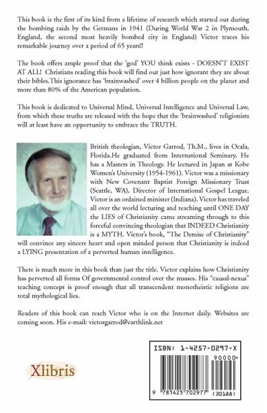 This book is the first of its kind from a lifetime of research which started out during the bombing raids by the Germans in 1941 (During World War 2 in Plymouth, England,the second most heavily bombed city in England) Victor traces his remarkable journey over a period of 65 years!! The book offers ample proof that the 'god' YOU think exists - DOESN'T EXIST AT ALL! Christians reading this book will find out just how ignorant they are about their bibles. This ignorance has 'brainwashed' over 4 billion people on the planet and more than 80% of the American population. This book is dedicated to Universal Mind, Universal Intelligence and Universal Law, from which these truths are released with the hope that the 'brainwashed' religionists will at least have an opportunity to embrace the TRUTH.