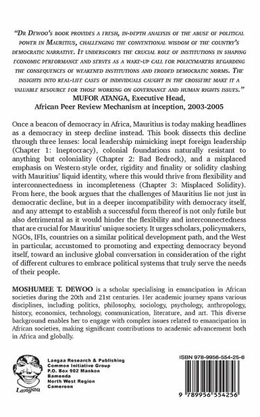 Once a beacon of democracy in Africa, Mauritius is today making headlines as a democracy in steep decline instead. This book dissects this decline through three lenses: local leadership mimicking inept foreign leadership (Chapter 1: Ineptocracy), colonial foundations naturally resistant to anything but coloniality (Chapter 2: Bad Bedrock), and a misplaced emphasis on Western-style order, rigidity and finality or solidity clashing with Mauritius' liquid identity, where this would thrive from flexibility and interconnectedness in incompleteness (Chapter 3: Misplaced Solidity). From here, the book argues that the challenges of Mauritius lie not just in democratic decline, but in a deeper incompatibility with democracy itself and any attempt to establish a successful form thereof is not only futile but also detrimental as it would hinder the flexibility and interconnectedness that are crucial for Mauritius' unique society. It urges scholars, policymakers, NGOs, IFIs, countries on a similar political development path, and the West in particular, accustomed to promoting and expecting democracy beyond itself, toward an inclusive global conversation in consideration of the right of different cultures to embrace political systems that truly serve the needs of their people. "DR DEWOO'S BOOK PROVIDES A FRESH, IN-DEPTH ANALYSIS OF THE ABUSE OF POLITICAL POWER IN MAURITIUS, CHALLENGING THE CONVENTIONAL WISDOM OF THE COUNTRY'S DEMOCRATIC NARRATIVE. IT UNDERSCORES THE CRUCIAL ROLE OF INSTITUTIONS IN SHAPING ECONOMIC PERFORMANCE AND SERVES AS A WAKE-UP CALL FOR POLICYMAKERS REGARDING THE CONSEQUENCES OF WEAKENED INSTITUTIONS AND ERODED DEMOCRATIC NORMS. THE INSIGHTS INTO REAL-LIFE CASES OF INDIVIDUALS CAUGHT IN THE CROSSFIRE MAKE IT A VALUABLE RESOURCE FOR THOSE WORKING ON GOVERNANCE AND HUMAN RIGHTS ISSUES." MUFOR ATANGA, Executive Head, African Peer Review Mechanism at inception, 2003-2005