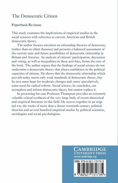 This 1970 study examines the implications of empirical studies in the social sciences with reference to various strands of American and British democratic theory. In presenting his case Professor Thompson provides an extremely valuable critical synthesis of a very large body of theoretical and empirical literature in this field. He weaves together in an original way the works of more than a dozen twentieth-century political theorists and several hundred empirical studies by political scientists, sociologists and social psychologists.