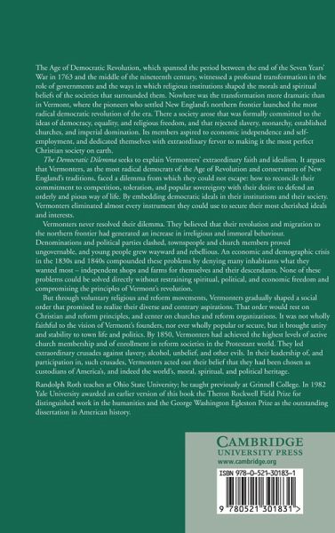 The Democratic Dilemma seeks to explain Vermonters' extraordinary faith and idealism. It argues that Vermonters, as the most radical democrats of the Age of Revolution and conservators of New England's traditions, faced a dilemma: how to reconcile their commitment to competition, toleration, and popular sovereignty with their desire to defend an orderly and pious way of life. By embedding democratic ideals in their institutions and their society. Denominations and political parties clashed, townspeople and church members proved ungovernable, and young people grew wayward and rebellious. An economic and demographic crisis in the 1830s and 1840s compounded these problems by denying many inhabitants what they wanted most independent shops and farms for themselves and their descendants. None of these problems could he solved without restraining spiritual, political, and economic freedom and compromising the principles of Vermont's revolution.