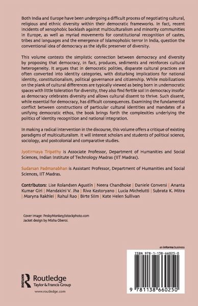 List of Abbreviations. Acknowledgements. Preface. Introduction: Democracy and the Production of Cultural Diversity. 1. Limits to Negotiations of Identities Riva Kastoryano 2. Multicultural Nationhood and the State in India Subrata K. Mitra 3. Rethinking Pluralism and Rights: Meditative Verbs of Co-Realizations and the Challenges of Transformations Ananta Kumar Giri 4. Democracy, Diversity and Contestation: A Transnational European Perspective Lise Rolandsen Agustín and Birte Siim 5. Democracy Promotion and the Problem of Peaceful Co-existence: Exploring the 'Democratic Diplomacy' of India Kate Helen Sullivan 6. Postcolonial Cosmopolitanism: Making Place for Nationalism Rahul Rao 7. Descriptive and Normative Pluralism: Making the Transition Neera Chandhoke 8. Democracy, Pluralism and Diversity: India and the European Union between Globalization and the Nation-State Daniele Conversi 9. Democracy and Diversity and the Vernacularization Framework Lucia Michelutti 10. A Comparative Study of Multiculturalism in Theory and Practice in the European Union and India Maryna Rakhlei 11. Multiculturalism Re-visited Mandakini V. Jha. Select Bibliography. About the Editors. Notes on Contributors. Index