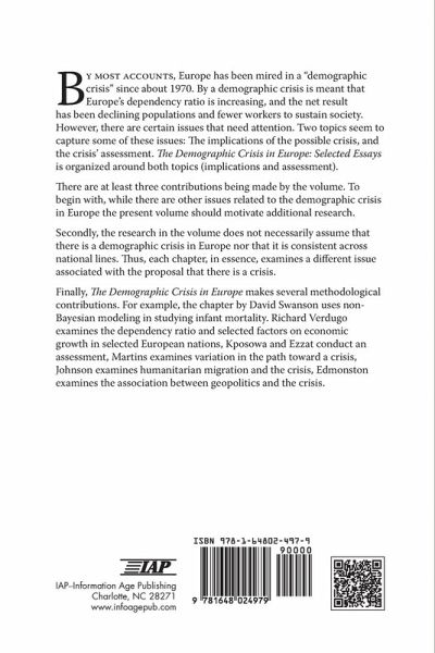 By most accounts, Europe has been mired in a "demographic crisis" since about 1970. By a demographic crisis is meant that Europe's dependency ratio is increasing, and the net result has been declining populations and fewer workers to sustain society. However, there are certain issues that need attention. Two topics seem to capture some of these issues: The implications of the possible crisis, and the crisis' assessment. The present volume is organized around both topics (implications and assessment). There are at least three contributions being made by the proposed volume. To begin with, while there are other issues related to the demographic crisis in Europe the present volume should motivate additional research. Secondly, the research in the proposed volume does not necessarily assume that there is a demographic crisis in Europe nor that it is consistent across national lines. Thus, each chapter, in essence, examines a different issue associated with the proposal that there is a crisis. Finally, the present volume makes several methodological contributions. For example, the chapter by David Swanson uses non-Bayesian modeling in studying infant mortality. Richard Verdugo examines the dependency ratio and selected factors on economic growth in selected European nations, Kposowa and Ezzat conduct an assessment, Martins examines variation in the path toward a crisis, Johnson examines humanitarian migration and the crisis, Edmonston examines the association between geopolitics and the crisis.