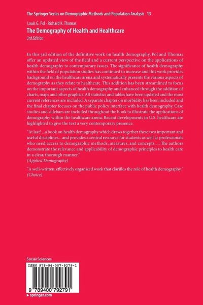 In this 3rd edition of the definitive work on health demography, Pol and Thomas offer an updated view of the field and a current perspective on the applications of health demography to contemporary issues. The significance of health demography within the field of population studies has continued to increase and this work provides background on the healthcare arena and systematically presents the various aspects of demography as they relate to healthcare. This addition has been streamlined to focus on the important aspects of health demography and enhanced through the addition of charts, maps and other graphics. All statistics and tables have been updated and the most current references are included. A separate chapter on morbidity has been included and the final chapter focuses on the public policy interface with health demography. Case studies and sidebars are included throughout the book to illustrate the applications of demography within the healthcare arena. Recent developments in U.S. healthcare are highlighted to give the text a very contemporary presence.