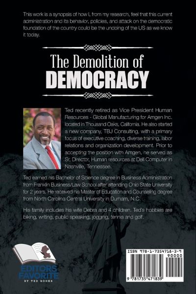 The Demolition of Democracy was motivated by what the author views as a disappearing moralistic value gene in the body and soul of America with new realities developing every day under the new Trump administration. Taken from a personal standpoint with inputs from the blue-collar workers and the international opinions, the book gives substance to what Bagley sees as the administration's failure and sheer disregard for the needs of the nation and the country's desperate need for a sound domestic and international leadership. At its core, The Demolition of Democracy encourages readers - especially the people of America - to scrutinize not only the president but all government leaders and their capacity to serve. It is a call-to-action for everyone to vote, educate themselves and let their voices be heard.