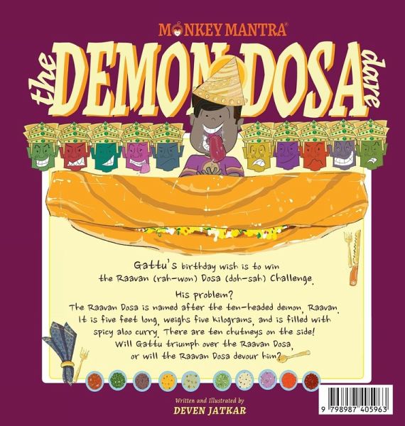 Gattu's birthday wish is to win the Raavan (rah-won) Dosa (doh-sah) Challenge.His problem? The Raavan Dosa is named after the ten-headed demon, Raavan. It is five feet long, weighs five kilograms, and is filled with spicy aloo curry. There are ten chutneys on the side! Will Gattu triumph over the Raavan Dosa, or will the Raavan Dosa devour him?