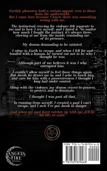 Demons come to Earth for fun, but I came here because I knew something was wrong with me. The instinctual craving for violence felt separate from how I see myself, and I hated it. No matter how much I fought the instinct, it was always there, clawing at me from the inside and reminding me of its presence. My demon was demanding to be satiated. I wanted to escape, and when I fell for and bonded with a human, he turned out not to be who I thought he was. Although part of me believes it was I who corrupted him. I couldn't allow myself to feel those things again. But Jacob draws me in, and I ache to touch and care for him with a part of me I long thought I had under control. My demon craves to possess, protect, and dominate. I thought I was past all that. In running from myself, I created a past I can't escape, and now I've put Jacob in danger. And when my past lover catches up with me, it'll be his life or mine.