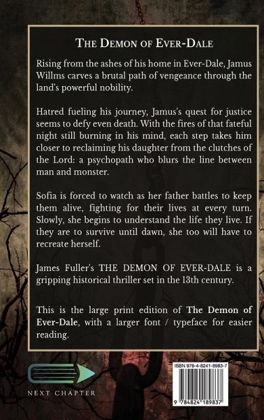 Rising from the ashes of his home in Ever-Dale, Jamus Willms carves a brutal path of vengeance through the land's powerful nobility. Hatred fueling his journey, Jamus's quest for justice seems to defy even death. With the fires of that fateful night still burning in his mind, each step takes him closer to reclaiming his daughter from the clutches of the Lord: a psychopath who blurs the line between man and monster. Sofia is forced to watch as her father battles to keep them alive, fighting for their lives at every turn. Slowly, she begins to understand the life they live. If they are to survive until dawn, she too will have to recreate herself. James Fuller's THE DEMON OF EVER-DALE is a gripping historical thriller set in the 13th century. This is the large print edition of The Demon of Ever-Dale, with a larger font / typeface for easier reading.