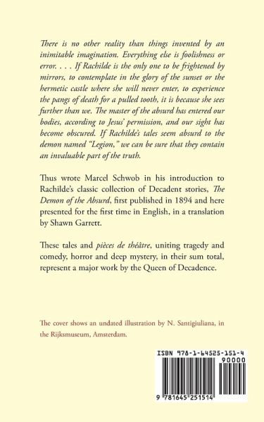 There is no other reality than things invented by an inimitable imagination. Everything else is foolishness or error. . . . If Rachilde is the only one to be frightened by mirrors, to contemplate in the glory of the sunset or the hermetic castle where she will never enter, to experience the pangs of death for a pulled tooth, it is because she sees further than we. The master of the absurd has entered our bodies, according to Jesus' permission, and our sight has become obscured. If Rachilde's tales seem absurd to the demon named "Legion," we can be sure that they contain an invaluable part of the truth. Thus wrote Marcel Schwob in his introduction to Rachilde's classic collection of Decadent stories, The Demon of the Absurd, first published in 1894 and here presented for the first time in English, in a translation by Shawn Garrett. These tales and pièces de théâtre, uniting tragedy and comedy, horror and deep mystery, in their sum total, represent a major work by the Queen of Decadence.