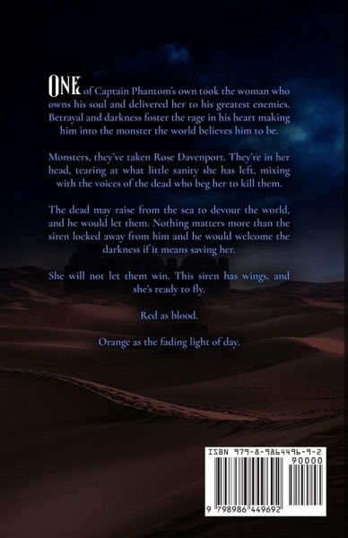 The Sea is a Grave All of the Dead Have Come Out to Play One of Captain Phantom's own took the woman who owns his soul and delivered her to his greatest enemies. Betrayal and darkness foster the rage in his heart making him into the monster the world believes him to be. Monsters, they've taken Rose Davenport. They're in her head, tearing at what little sanity she has left, mixing with the voices of the dead who beg her to kill them. The dead may raise from the sea to devour the world, and he would let them. Nothing matters more than the siren locked away from him and he would welcome the darkness if it means saving her. She will not let them win. This siren has wings, and she's ready to fly. Red as Blood. Orange as the Fading Light of Day.