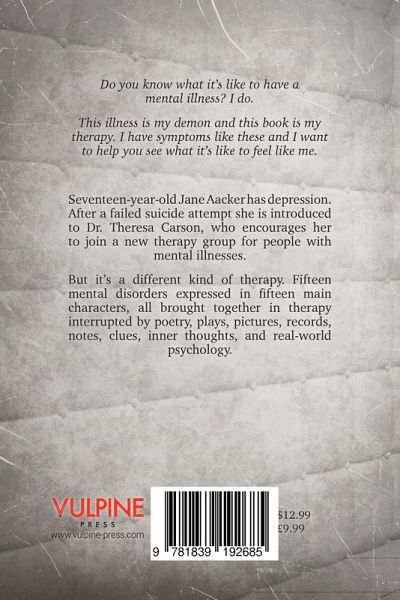 Do you know what it's like to have a mental illness? I do. This illness is my demon and this book is my therapy. I have symptoms like these and I want to help you see what it's like to feel like me. Seventeenyearold Jane Aacker has depression. After a failed suicide attempt she is introduced to Dr. Theresa Carson, who encourages her to join a new therapy group for people with mental illnesses. But it's a different kind of therapy. Fifteen mental disorders expressed in fifteen main characters, all brought together in therapy interrupted by poetry, plays, pictures, records, notes, clues, inner thoughts, and realworld psychology.