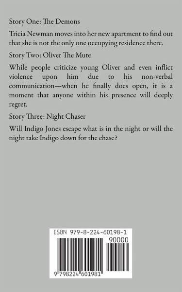 Story One: The Demons Tricia Newman moves into her new apartment to find out that she is not the only one occupying residence there. Story Two: Oliver The Mute While people criticize young Oliver and even inflict violence upon him due to his non-verbal communication-when he finally does open, it is a moment that anyone within his presence will deeply regret. Story Three: Night Chaser Will Indigo Jones escape what is in the night or will the night take Indigo down for the chase?
