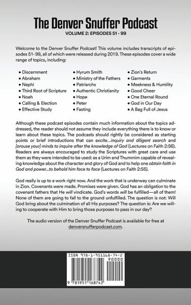 This volume of The Denver Snuffer Podcast includes transcripts of episodes 51-99, all of which were released during 2019. Each episode consists of one or more of the following kinds of recordings: ¿ Remarks made by Denver during various lectures, meetings or Q&A sessions that had previously been recorded and released ¿ Remarks by Denver that had previously been recorded, but not released ¿ Previously-published written material that Denver recorded for the podcast ¿ Recordings of new material for the podcast Readers with a keen eye will also note that in some cases, Denver used an audio transcript as the basis for preparing an "expanded transcript" or paper, with clarifying comments or additional material added in, that was not part of the original audio recording. This was particularly the case in Lectures 5-10 of the 40 Years in Mormonism lecture series, where the original audio transcripts were greatly expanded into papers (and ultimately Denver's book titled Preserving the Restoration, published by Mill Creek Press in 2015). In some cases, a podcast transcript may include these written additions even though they were not present in the audio version of the podcast, because they provide additional depth and detail to the subject matter and may be of value to the reader. Episodes in this volume cover a wide range of topics, including: Discernment Abraham Nephi Third Root of Scripture Noah Calling & Election Effective Study Hyrum Smith Ministry of the Fathers Patriarchs Authentic Christianity Hope Peter Fasting Zion's Return Garments Meekness & Humility Good Cheer One Eternal Round God in Our Day A Bag Full of Jesus Although they each contain much information about the topics addressed, these podcast episodes should rightly be considered as starting points, or brief introductions, useful to "excite inquiry and diligent search" and to "arouse [your] mind[s] to inquire after the knowledge of God" (Lectures on Faith, 2:55-56). They should prompt us to read the Scriptures more carefully, and use them as they were intended to be used - as a Urim and Thummim capable of revealing knowledge about the character and glory of God, and help us "obtain faith in God, and power...to behold Him face to face." God really is up to a work right now. And the work that is underway can culminate in Zion. Covenants were made. Promises were given. God has an obligation to the covenant fathers that He will vindicate. God's words will be fulfilled-all of them! None of them are going to fall to the ground unfulfilled. The question is not, will God bring about the culmination of all His purposes? The question is, are we willing to cooperate with Him to bring those purposes to pass in our day? (Episode 85: Zion's Return, Part 2) The audio version of the Denver Snuffer Podcast is available for free at denversnufferpodcast.com.