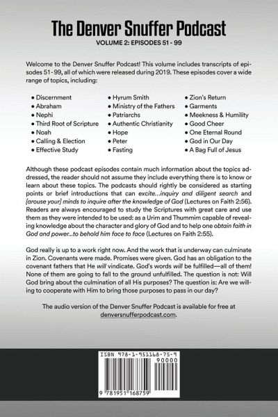 This volume of The Denver Snuffer Podcast includes transcripts of episodes 51-99, all of which were released during 2019. Each episode consists of one or more of the following kinds of recordings: ¿ Remarks made by Denver during various lectures, meetings or Q&A sessions that had previously been recorded and released ¿ Remarks by Denver that had previously been recorded, but not released ¿ Previously-published written material that Denver recorded for the podcast ¿ Recordings of new material for the podcast Readers with a keen eye will also note that in some cases, Denver used an audio transcript as the basis for preparing an "expanded transcript" or paper, with clarifying comments or additional material added in, that was not part of the original audio recording. This was particularly the case in Lectures 5-10 of the 40 Years in Mormonism lecture series, where the original audio transcripts were greatly expanded into papers (and ultimately Denver's book titled Preserving the Restoration, published by Mill Creek Press in 2015). In some cases, a podcast transcript may include these written additions even though they were not present in the audio version of the podcast, because they provide additional depth and detail to the subject matter and may be of value to the reader. Episodes in this volume cover a wide range of topics, including: Discernment Abraham Nephi Third Root of Scripture Noah Calling & Election Effective Study Hyrum Smith Ministry of the Fathers Patriarchs Authentic Christianity Hope Peter Fasting Zion's Return Garments Meekness & Humility Good Cheer One Eternal Round God in Our Day A Bag Full of Jesus Although they each contain much information about the topics addressed, these podcast episodes should rightly be considered as starting points, or brief introductions, useful to "excite inquiry and diligent search" and to "arouse [your] mind[s] to inquire after the knowledge of God" (Lectures on Faith, 2:55-56). They should prompt us to read the Scriptures more carefully, and use them as they were intended to be used - as a Urim and Thummim capable of revealing knowledge about the character and glory of God, and help us "obtain faith in God, and power...to behold Him face to face." God really is up to a work right now. And the work that is underway can culminate in Zion. Covenants were made. Promises were given. God has an obligation to the covenant fathers that He will vindicate. God's words will be fulfilled-all of them! None of them are going to fall to the ground unfulfilled. The question is not, will God bring about the culmination of all His purposes? The question is, are we willing to cooperate with Him to bring those purposes to pass in our day? (Episode 85: Zion's Return, Part 2) The audio version of the Denver Snuffer Podcast is available for free at denversnufferpodcast.com.