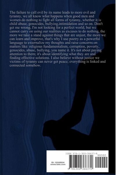 The failure to call evil by its name leads to more evil and tyranny, we all know what happens when good men and women do nothing to fight all forms of tyranny, whether it is child abuse, genocides, bullying,intimidation and so on. Don't get me wrong, I'm not looking for a perfect world, but we cannot carry on using our realities as excuses to do nothing, the more we take a stand against things that are unjust, the more we can learn and improve, that's why I use poetry as a powerful language to externalize my thoughts and raise concerns on matters like: religious fundamentalism, corruption, poverty, genocides, abuse, bullying, you name it. It's not about paying attention to them; it's about identifying what they are and finding effective solutions. I also believe without justice we victims of tyranny can never get peace, everything is linked and connected somehow.
